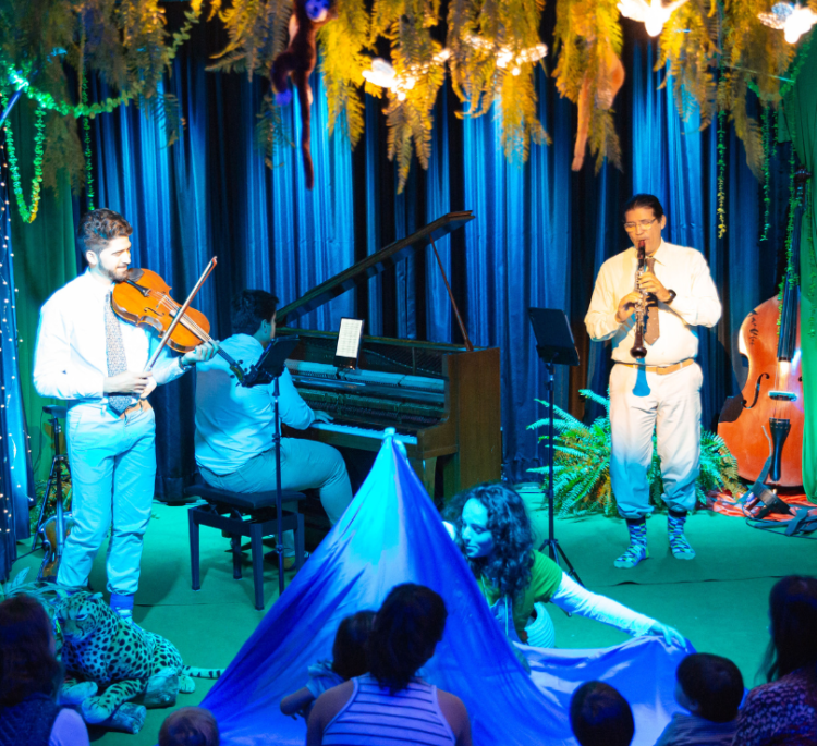 A música ao vivo é executada pelo Trio Dourado Brasil, composto por Luiz Paulo Dourado (violino e viola), Guilherme Baldovino (piano) e Ricardo Dourado Freire (clarineta e clarone), além da participação especial de Leonardo Sousa (percussão étnica). A interpretação da atriz Bel Ollaik traz à cena a magia dos contos de fadas, convidando os pequenos a viverem uma experiência única.