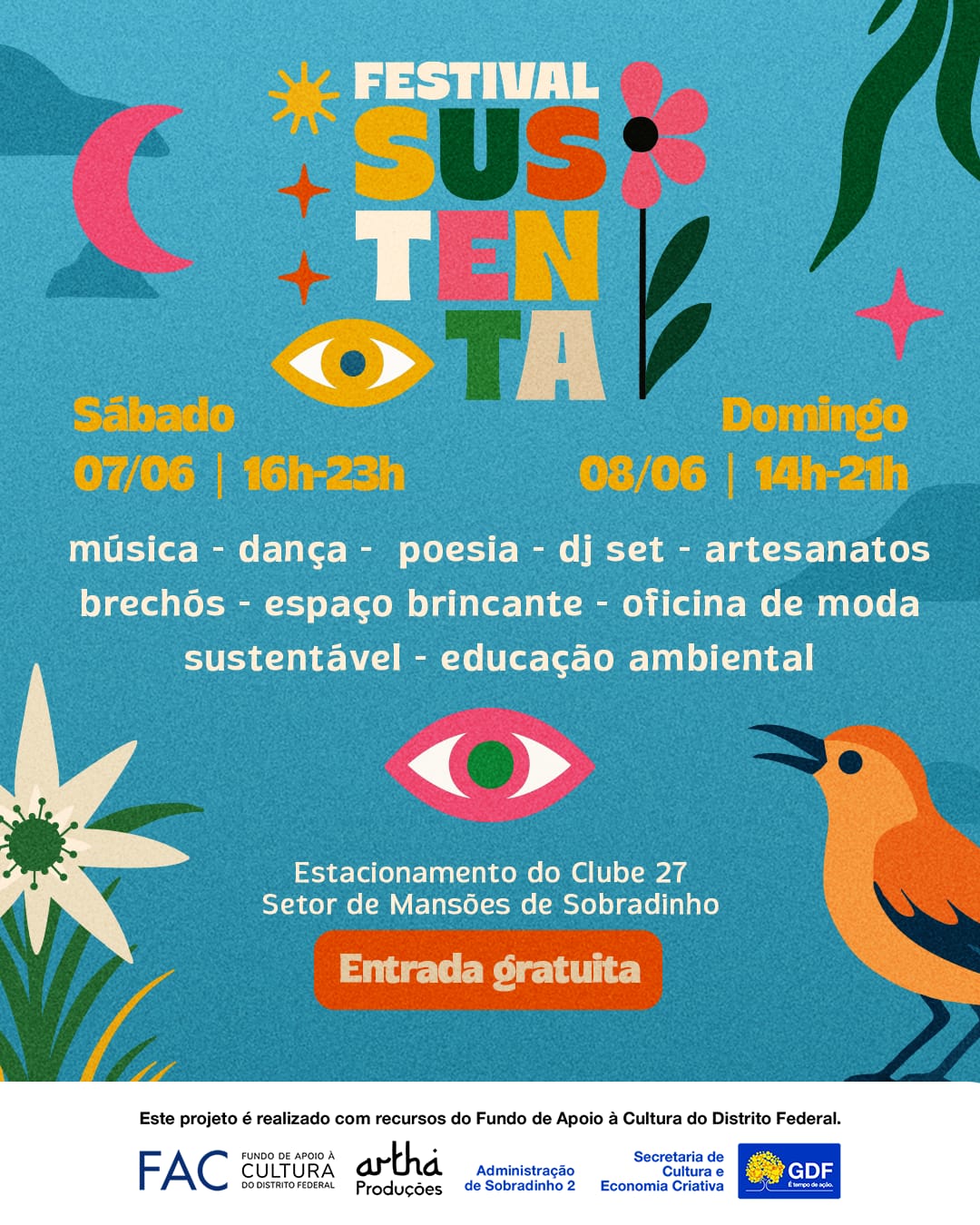 Nos dias 7 e 8 de junho, Sobradinho será palco do “Festival sustenta“, evento gratuito que une música, dança, poesia, moda sustentável e ações de educação ambiental. A programação acontece no Estacionamento do Clube 27, no setor de mansões, e é aberta a todas as idades.