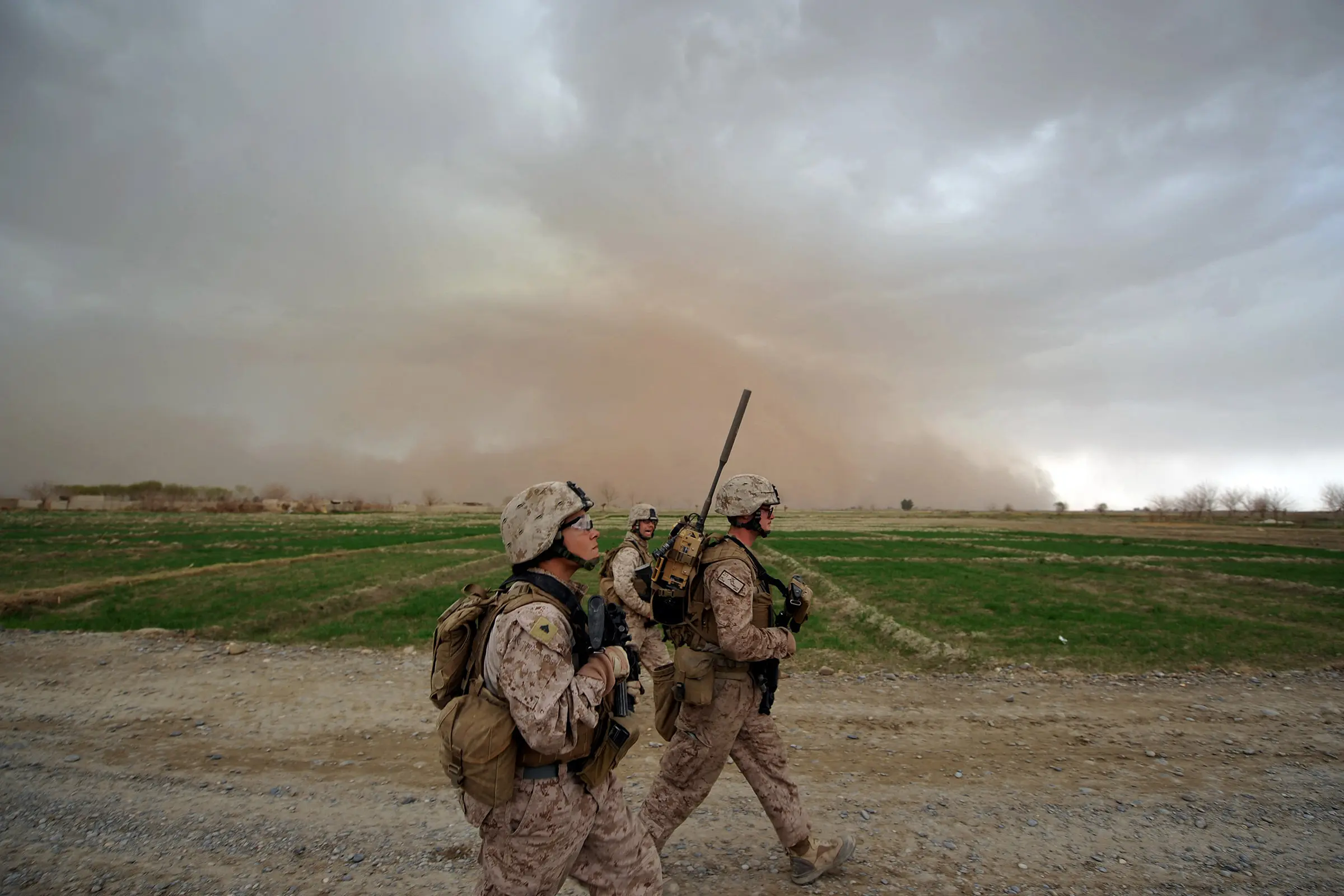 Fuzileiros Navais dos EUA, 2º Batalhão e 1º Regimento de Fuzileiros Navais retornam à sua base enquanto nuvens de chuva se acumulam em Gamser, sul do Afeganistão, em 22 de fevereiro de 2011. Adek Berry—AFP/Getty Images