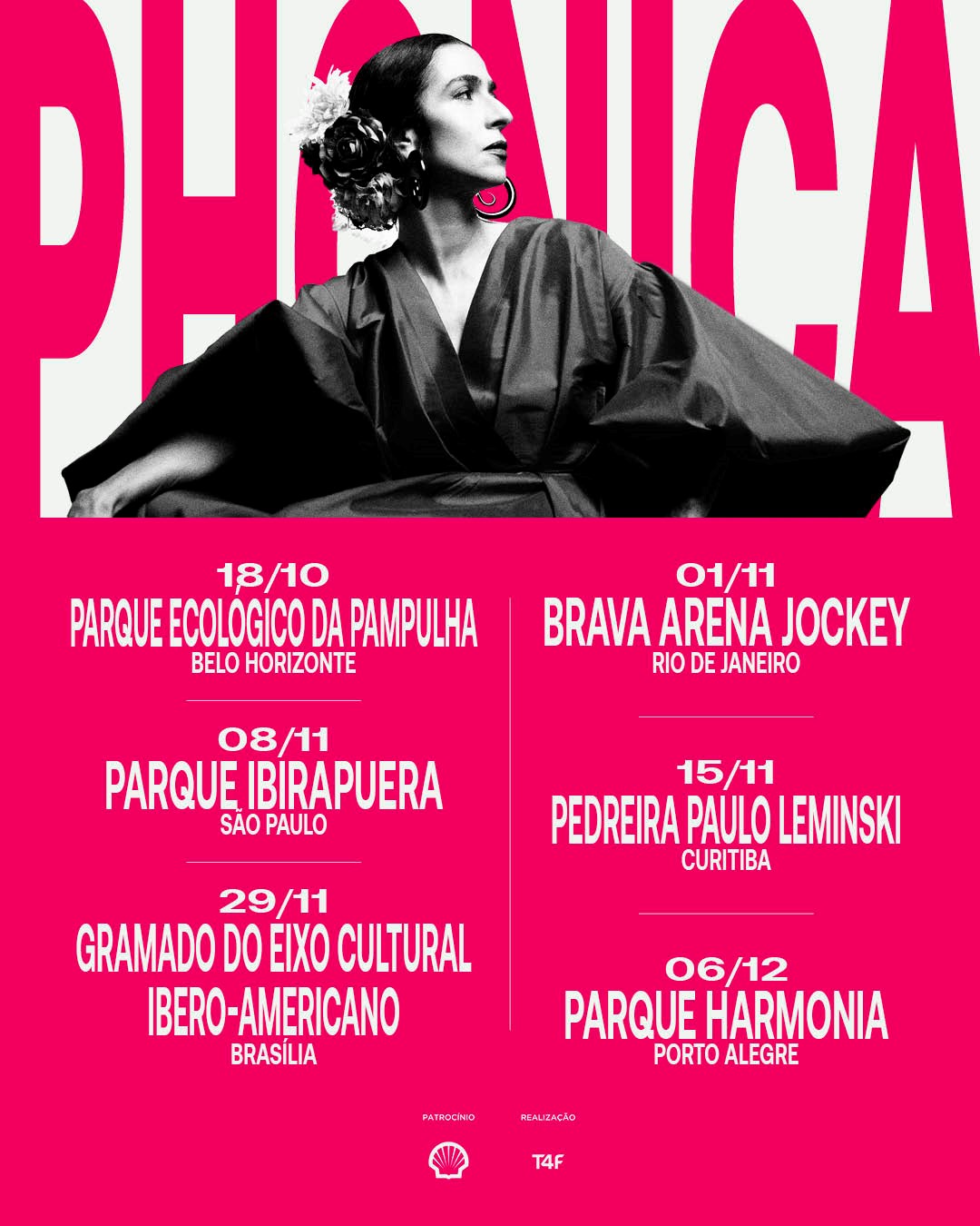 A cantora Marisa Monte inicia em outubro a turnê “Phonica: Marisa Monte & orquestra ao vivo”, projeto inédito que reúne sua banda e uma orquestra sinfônica com 55 músicos, sob regência do maestro André Bachur. O espetáculo, que percorre seis cidades, chega a Brasília em 29 de novembro, no Gramado do Eixo Cultural Ibero-Americano.