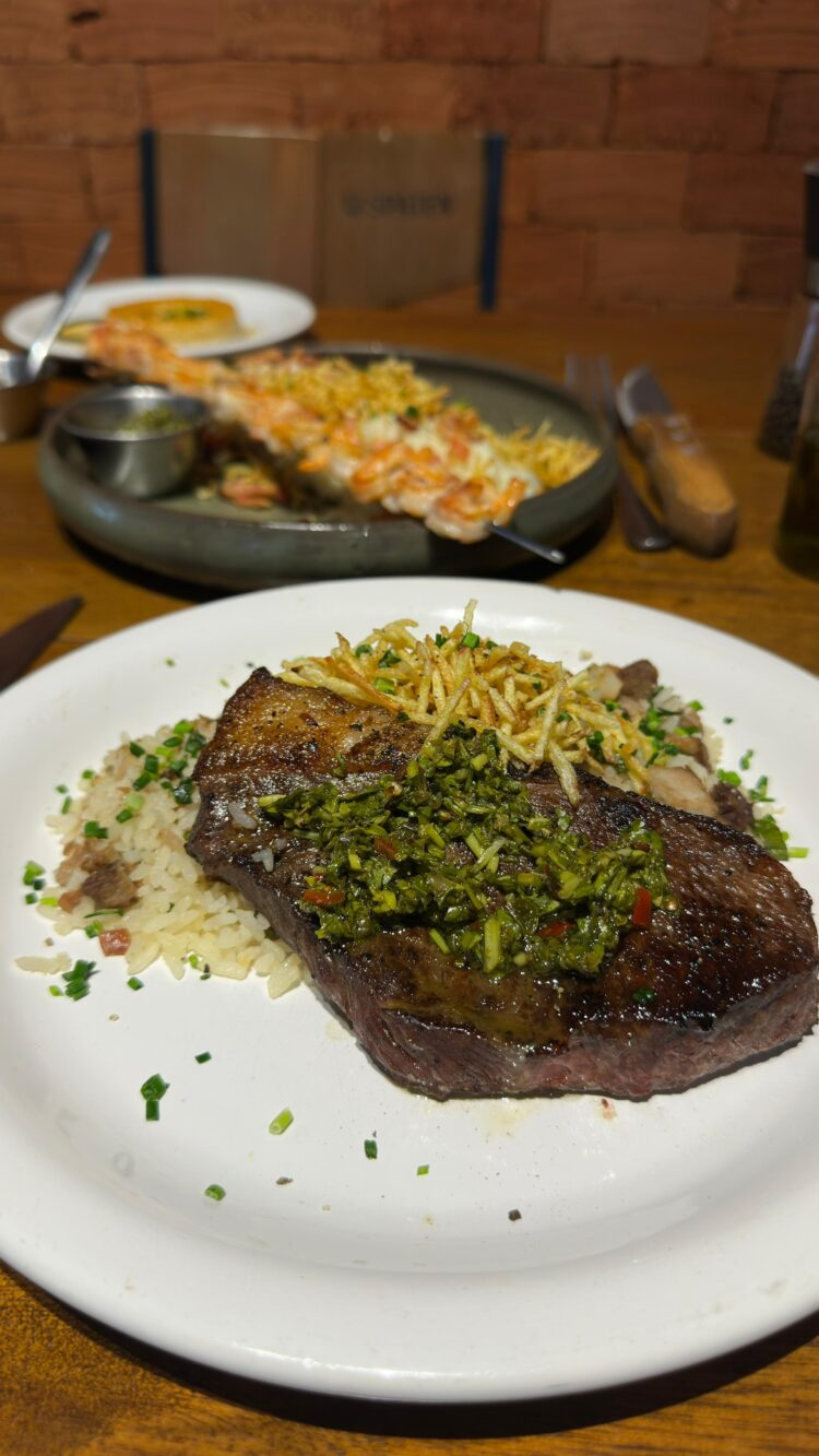 Já no jantar, a experiência ganha ainda mais intensidade. As entradas e sobremesas permanecem as mesmas, mas os pratos principais apostam em sabores robustos: a picanha ao chimichurri, com arroz do churrasqueiro e batata palha, ou o camarão no espeto, servido com arroz cremoso com bacon.