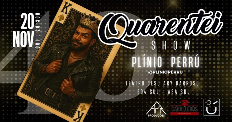 Depois de anos afastado da cena, Plínio Perrú decidiu que seu retorno merecia algo à altura da própria trajetória. Em vez de apenas subir ao palco novamente, ele escolheu transformar sua vivência em um espetáculo que mistura humor, memória e reinvenção. Assim nasce o “Quarentei Show”, que será apresentado em sessão única no dia 20 de novembro, às 20h30, no Teatro Ary Barroso, Sesc 504 Sul.