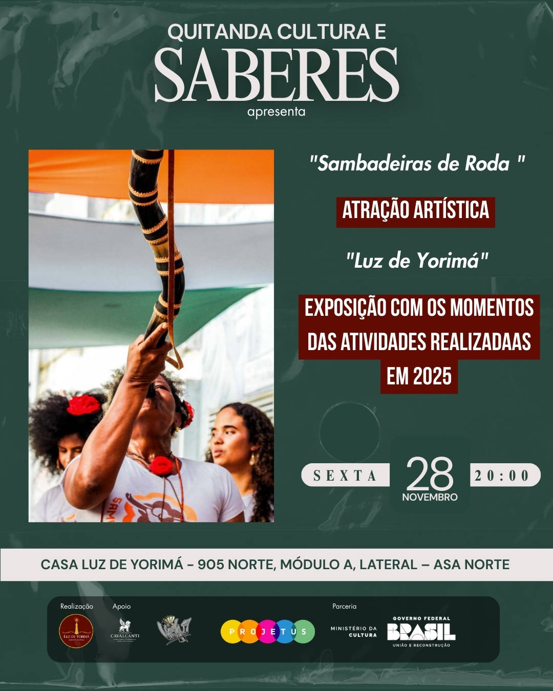 O projeto Quitanda Cultura e Saberes celebra o encerramento de sua edição de 2025 nesta sexta-feira (28), às 20h, com uma noite especial dedicada à ancestralidade, ao movimento comunitário e às expressões da cultura afro-brasileira. A programação, gratuita e aberta ao público, acontece na Casa Luz de Yorimá, na 905 Norte, e destaca a apresentação das Sambadeiras de Roda.