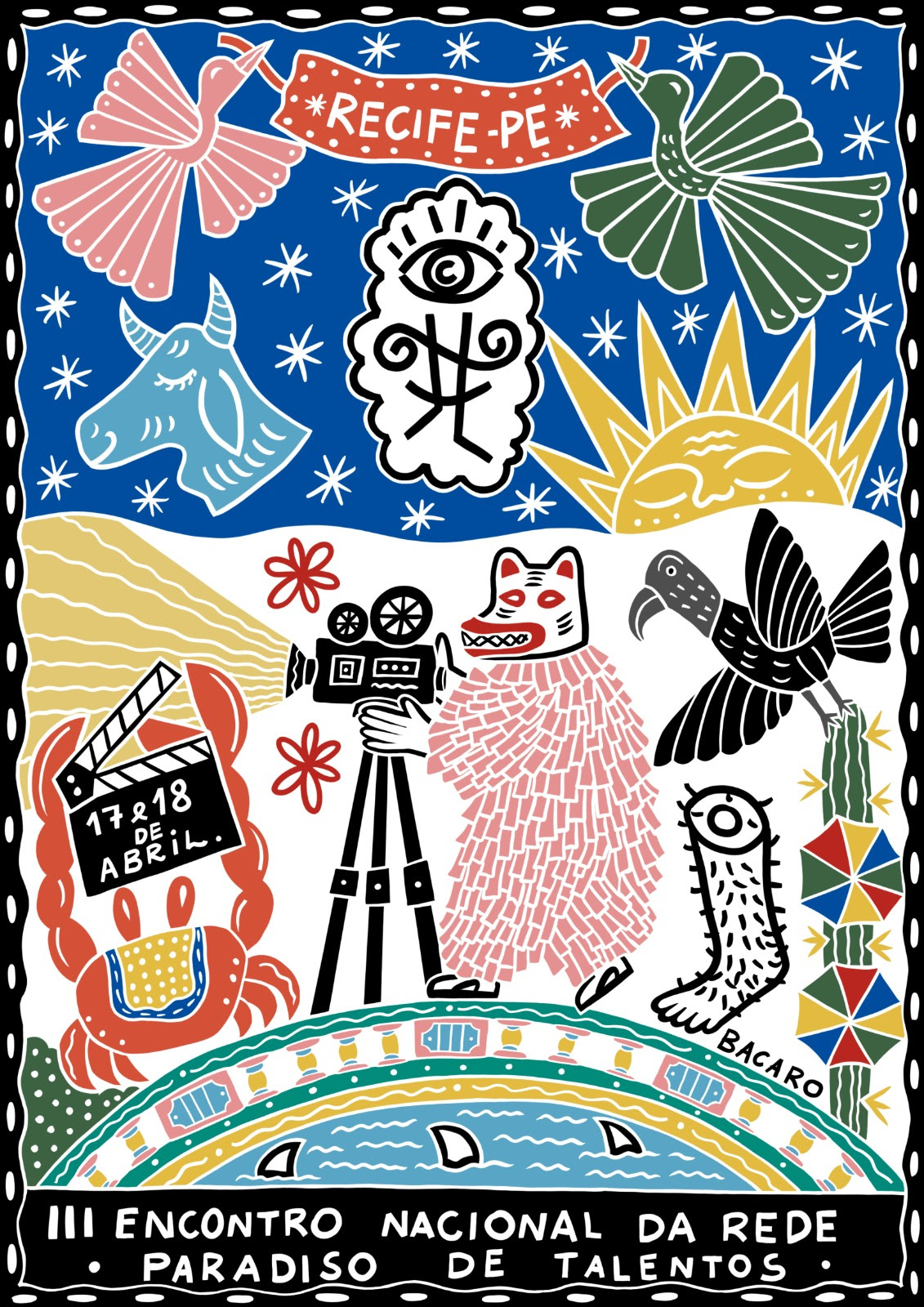 Além da programação voltada ao setor, o encontro também ganha identidade visual própria, assinada pelo artista pernambucano Bacaro Borges, filho do mestre da xilogravura J. Borges. A criação reúne símbolos marcantes da cultura pernambucana, como La Ursa, o caranguejo, o mandacaru, os tubarões das praias da capital, as sombrinhas do frevo e as pontes do Recife, combinados a referências do cinema local, com menções a obras como “O Agente Secreto”, “Cinema, Aspirinas e Urubus” e “Boi Neon”.